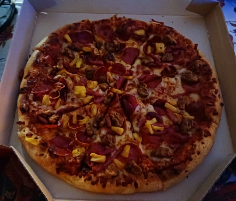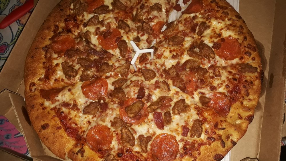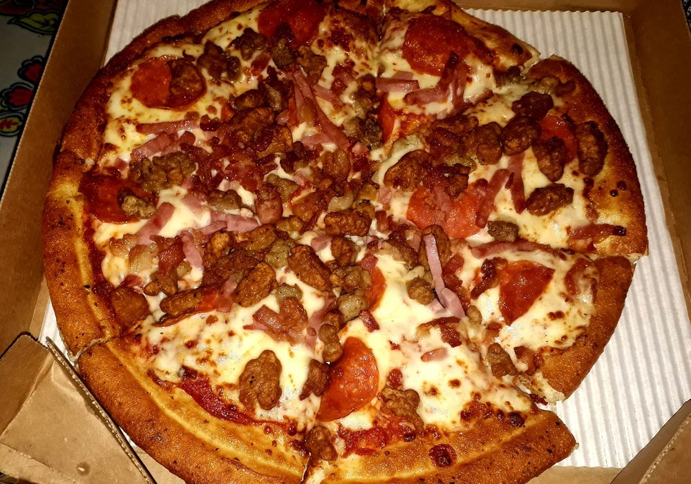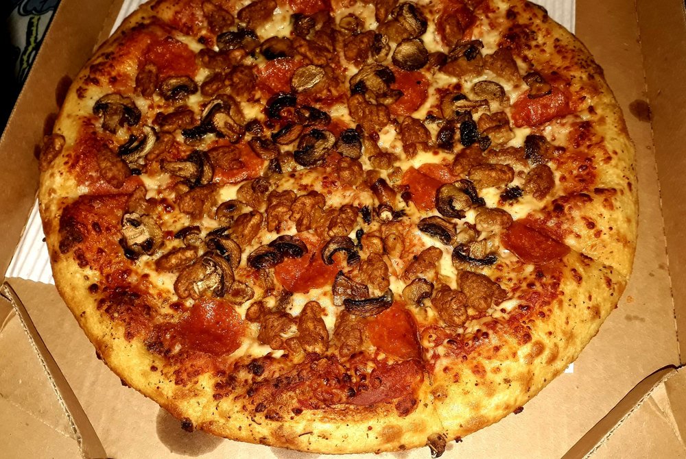 This loaded pizza is the perfect choice for family dinner or a lunch with your crew. Includes pepperoni, seasoned pork, beef, mushrooms, green bell peppers and onions.